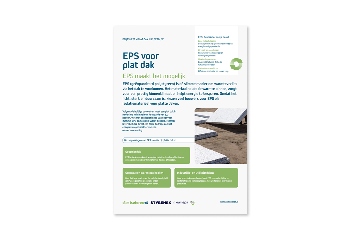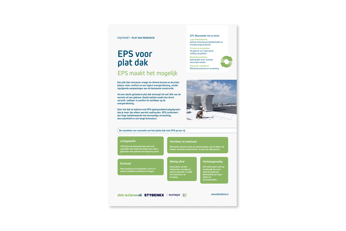 Bij het renoveren van een plat dak draait alles om balans: meer comfort en een lagere energierekening, zonder ingrijpende aanpassingen aan de constructie. EPS (geëxpandeerd polystyreen) maakt dat mogelijk – met maatwerk, circulariteit en een levensduur van minstens 75 jaar.