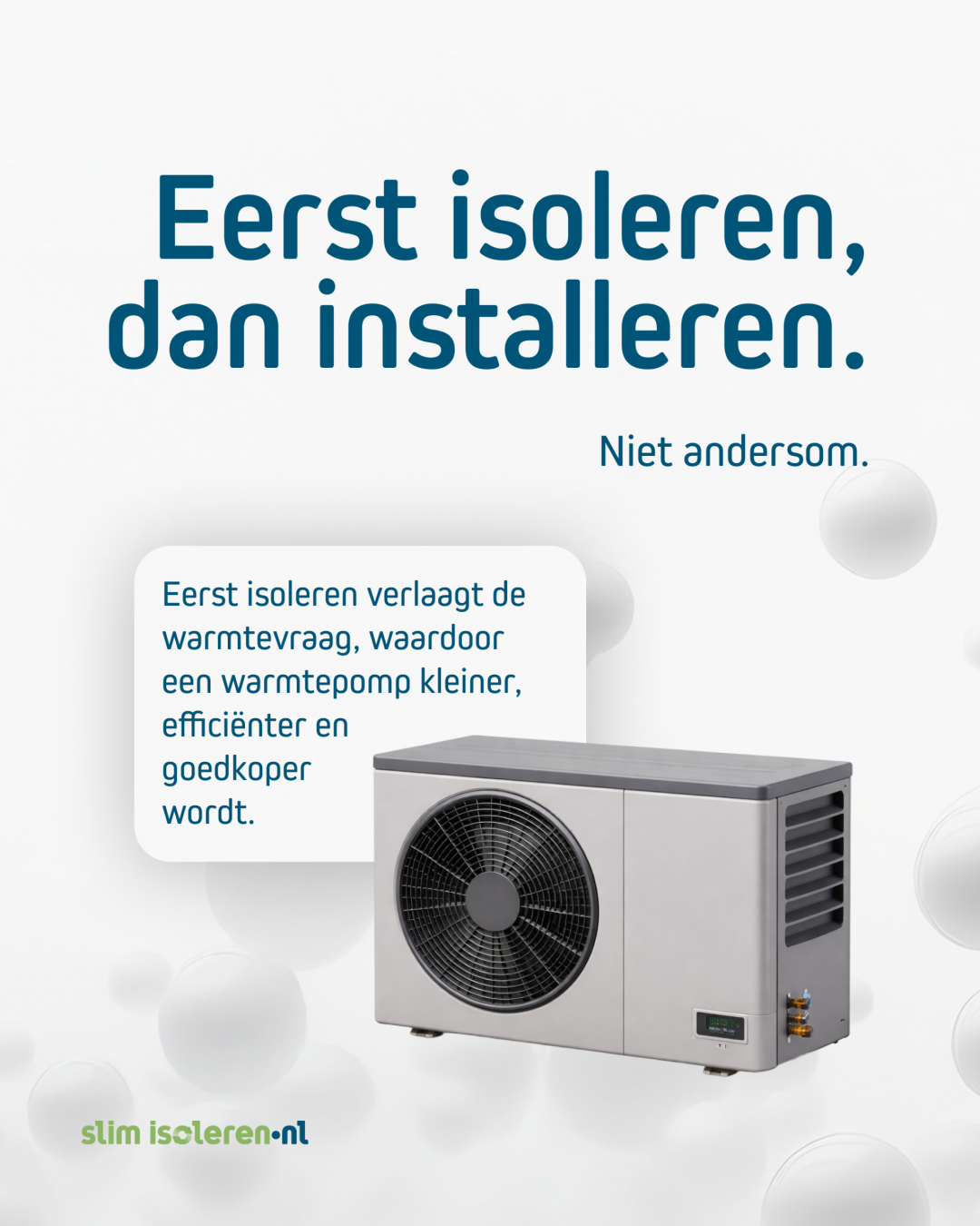 Een warmtepomp in een slecht geïsoleerde woning moet harder werken, meer vermogen hebben en hogere aanvoertemperaturen gebruiken. Datzelfde systeem in een goed geïsoleerde woning kan volstaan met een kleinere eenheid, lagere temperaturen en minder energieverbruik. Wie dus eerst isoleert, koopt niet alleen een goedkopere installatie — hij laat die installatie ook nog eens efficiënter en zuiniger werken voor de rest van zijn leven.